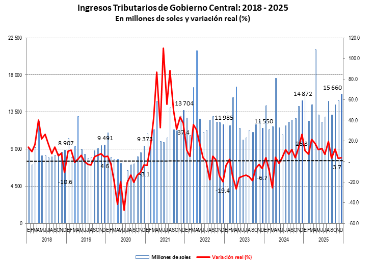 En diciembre 2025, los ingresos tributarios del Gobierno Central totalizaron S/. 15 660 millones representando un crecimiento de 3,7% en términos reales respecto de diciembre 2024, acumulándose 19 meses de crecimiento continuo de la recaudación. Este resultado se explica por la evolución positiva de la actividad económica con un crecimiento del Producto Bruto Interno (PBI) y la demanda interna; la expansión de las importaciones CIF; los favorables resultados empresariales obtenidos durante el ejercicio 2024 reflejados en la declaración anual del Impuesto a la Renta, y en los mayores pagos a cuenta mensuales del impuesto; la intensificación de las acciones de facilitación, control, fiscalización y recuperación de obligaciones tributarias de la SUNAT que permitieron incrementar la recaudación; el efecto favorable de diversos dispositivos como la aplicación del Decreto Legislativo N.° 1634 que aprobó el fraccionamiento especial (FRAES), que permitió recaudar S/.735 millones en el año 2025; el Decreto Legislativo N.° 1623 correspondiente al IGV aplicado a los Servicios Digitales con una recaudación de S/.624 millones en el año 2025; la Ley N.° 31557 y el Decreto Legislativo N.° 1644 sobre la afectación con el Impuesto Selectivo al Consumo (ISC) a los juegos y apuestas deportivas a distancia, que en conjunto recaudaron S/.397 millones en el año 2025; y el Decreto Supremo N.° 115-2024-EF que estableció la tasa del ISC a la cerveza en 0,047% de la UIT. En contraposición, se tuvo el impacto negativo en la recaudación por las mayores devoluciones de impuestos realizadas durante el año 2025 que fueron superiores en S/.5 391 millones a las del año 2024; la caída del tipo de cambio en 5,0%; y al efecto negativo por las modificaciones normativas tanto al Sistema de Pagos de Obligaciones Tributarias (Ley N.° 31903), la ampliación de la vigencia de la tasa reducida del 8% del Impuesto General a las Ventas (Ley N.° 32219), así como aquella que modificó la determinación de intereses por multas y devoluciones (Ley N.° 31962).