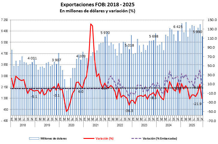 De esta forma, en el caso de las exportaciones embarcadas, en noviembre estas ascendieron a un valor FOB de US$ 8 142 millones, monto que representó un crecimiento de 6,2% respecto a las cifras de similar mes del año anterior. Este resultado reflejó principalmente los envíos al exterior de los Productos Tradicionales que aumentaron en 7,9% con un valor FOB de US$ 5 822 millones; por el contrario de los envíos de Productos No Tradicionales que aumentaron 2,0%, alcanzando un valor FOB de US$ 2 298 millones.