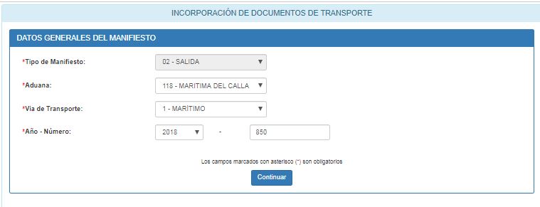 La Incorporación de Documentos de Transporte se accede mediante la opción del menú Manifiesto de Carga de Salida / Incorporación de Documentos de Transporte del Manifiesto de Carga, el sistema mostrará el siguiente formulario. En el formulario, el usuario debe ingresar los datos solicitados: DATOS GENERALES DEL MANIFIESTO