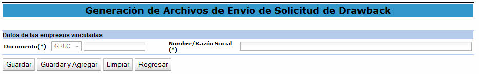 1. GENERAR ARCHIVO DE ENVIO DE SOLICITUD DRAWBACK En esta opción el usuario podrá ingresar los datos de su envío de solicitud DRAWBACK. La primera vez que se acceda al utilitario, los campos del formulario se mostrarán en blanco, una vez generado nuestro primer archivo ZIP los datos a mostrar seran los del último generado o del último archivo subido con la opción del punto 3.3. ![]() Tenemos los siguientes botones: