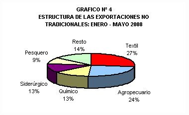En mayo de 2008, las exportaciones no tradicionales ascendieron a US$ 603 millones, registrando un crecimiento de 27,7% respecto de igual mes del año 2007. A nivel desagregado, todos sus componentes mostraron una evolución favorable, destacando la participación de las exportaciones del sector textil (41,6%), agropecuario (39,6%), metal – mecánico (37,9%), químico (32,7%), siderúrgico – metalúrgico (10,1%), minería no metálica (8,1%), pesquero (4,1%).